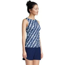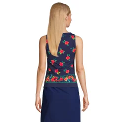Modest swim style is effortless wearing this petites’ Lands’ End high-neck tankini top.