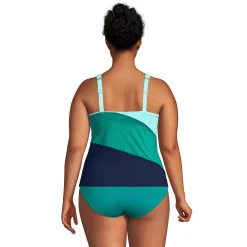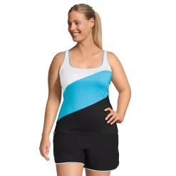 A diagonal colorblock print and UPF 50 sun protection makes this women’s Lands’ End tankini top a flattering choice for fun in the sun.