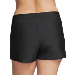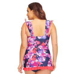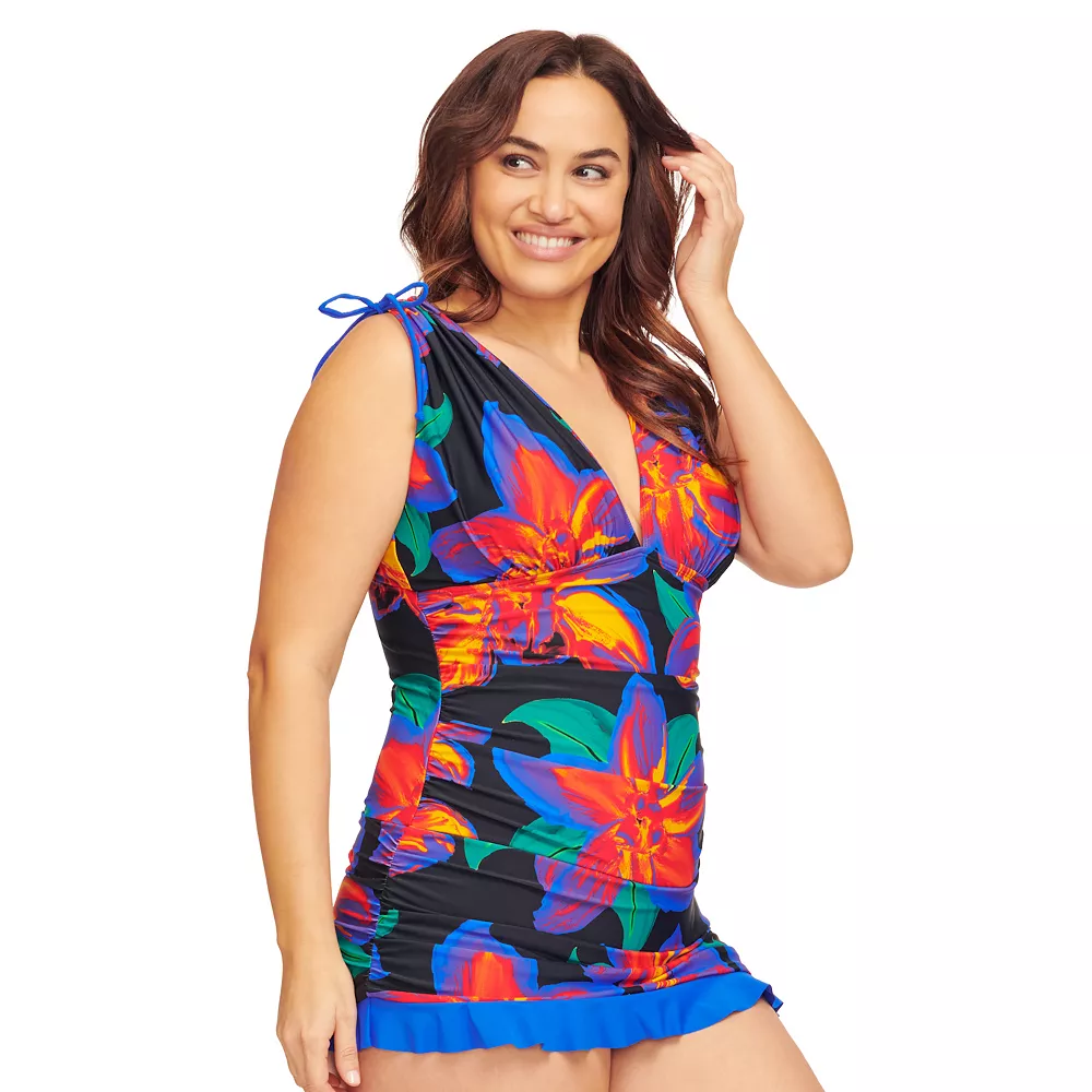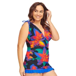 A tummy control panel, ruched sides and colorful pattern combine to make this women’s plus size Mazu Swim one-piece swimdress a fun, flattering choice.