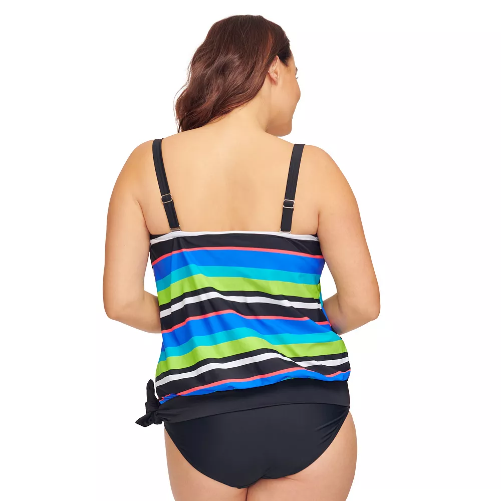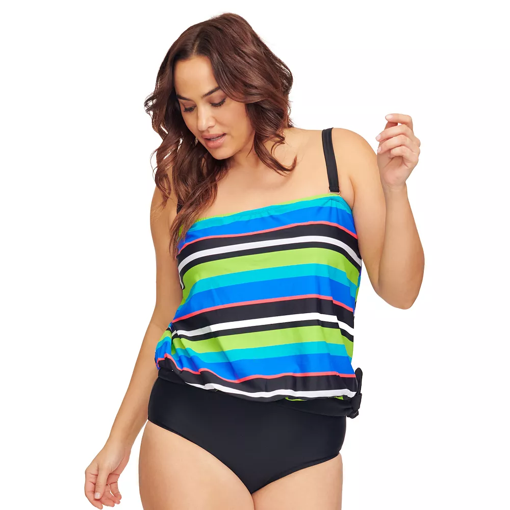This women’s plus size blouson tankini from Mazu Swim features a flattering flowy fit that hides any tummy concerns along with adjustable, removable straps for a custom fit.