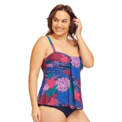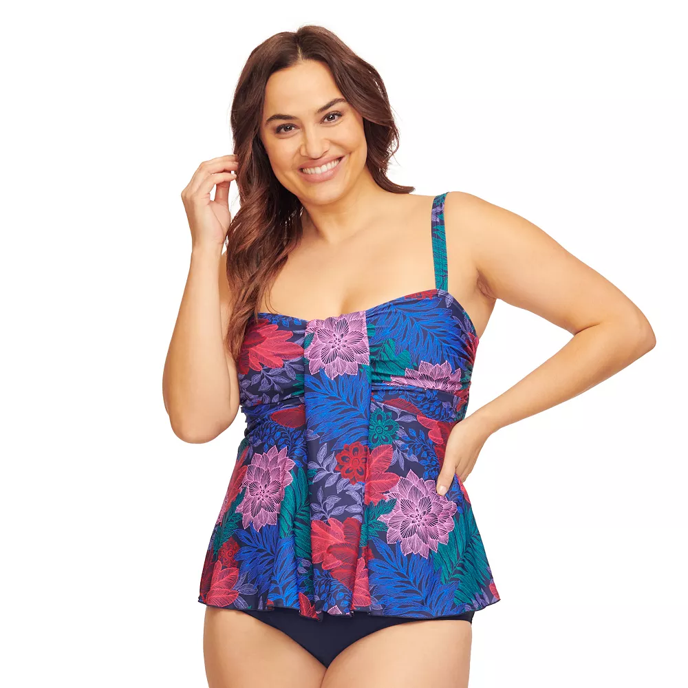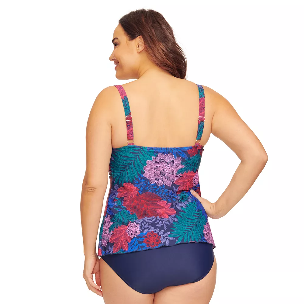 A colorful print and a draped design makes this women’s plus size Mazu Swim tankini top a great choice for beach or pool.