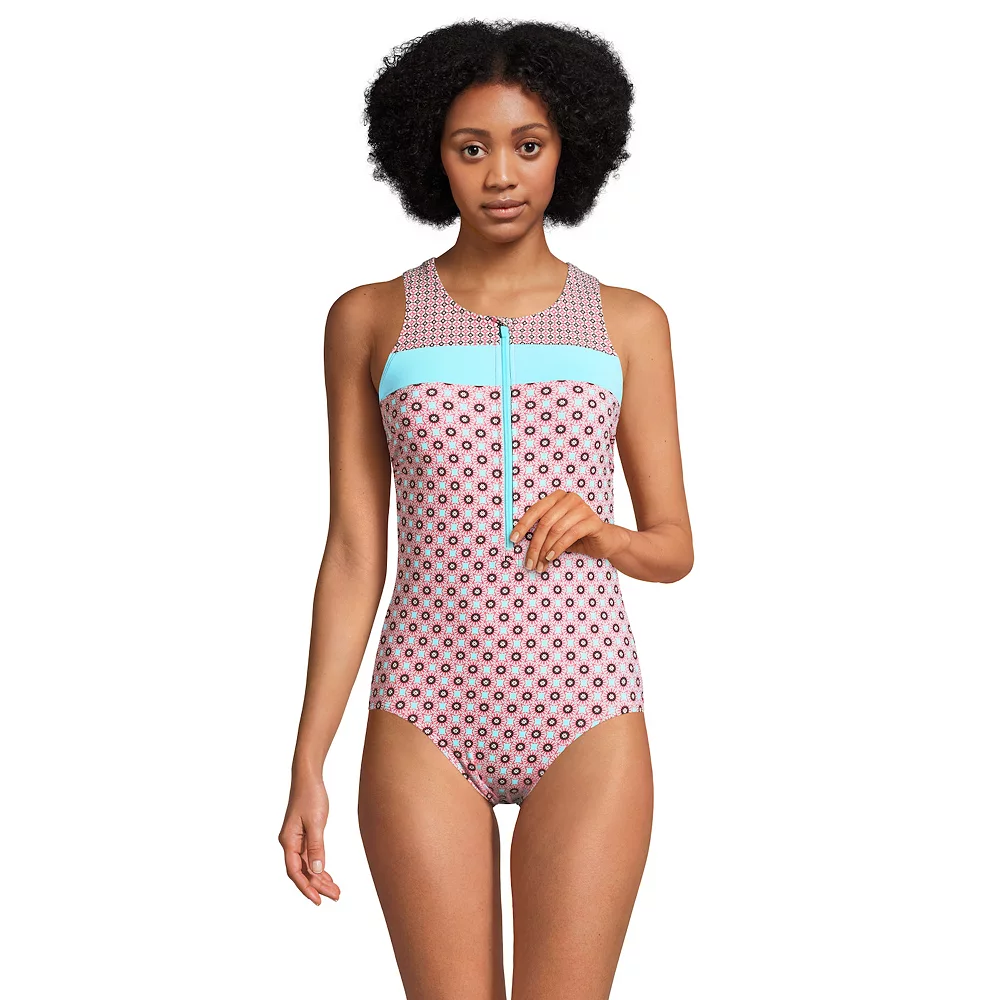 Whether you’re working out in the pool, or lounging next to it, you’ll love the lasting fit and feel of this women’s Lands’ End zip-front one-piece swimsuit.